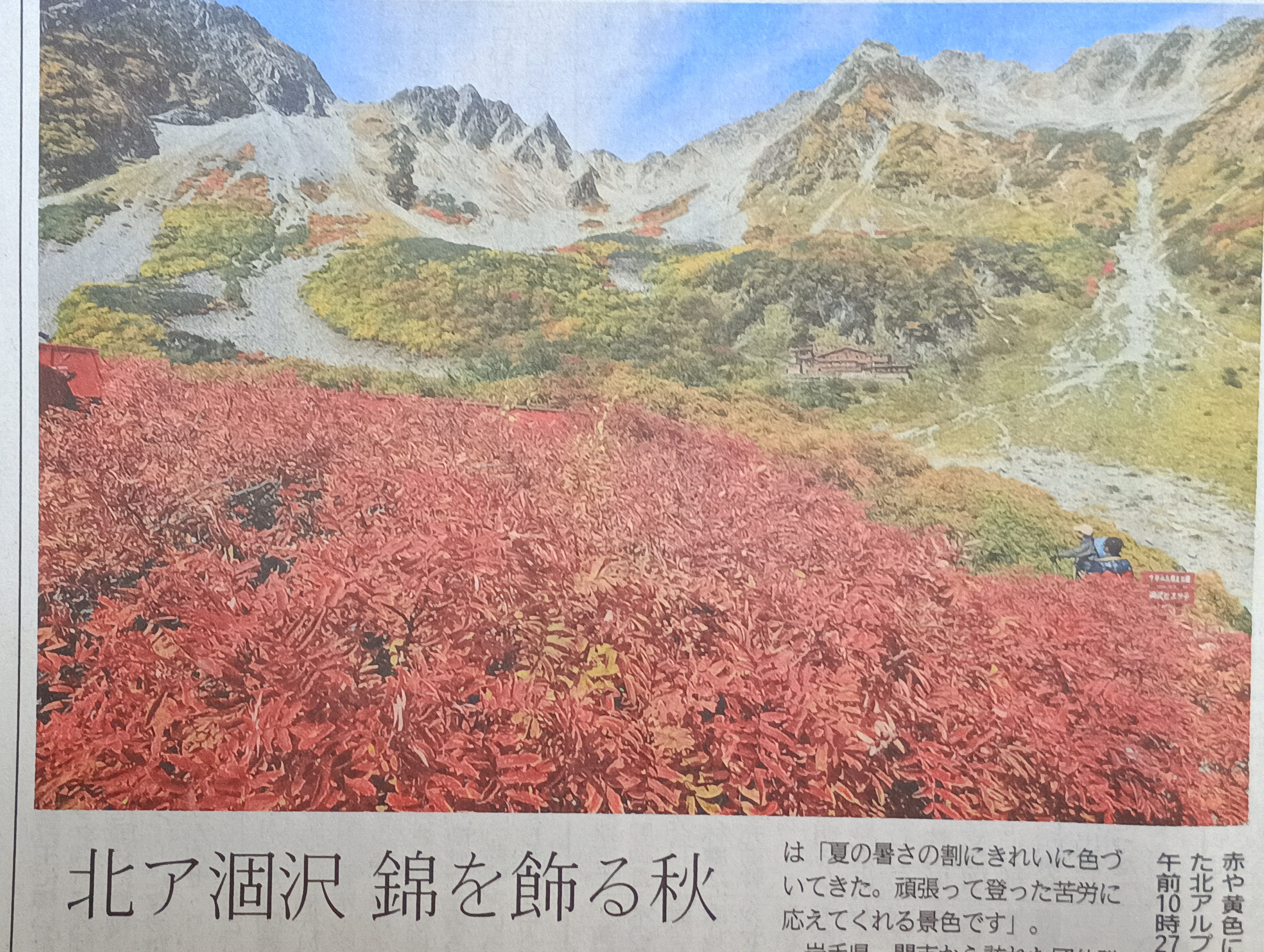 涸沢カールではナナカマドの鮮やかな赤色が目立ち、登山客の目を引いていた。山小屋「涸沢ヒュッテ」によると、今年は9月下旬から木々が入づき、朝の冷え込みが強まるのにつれて彩りを増した。涸沢ヒュッテの山口浩一専務は「夏の暑さの割にきれいに入りづいてきた。頑張って登った苦労に応えてくれる景色です」。